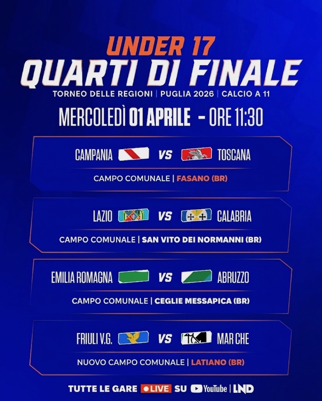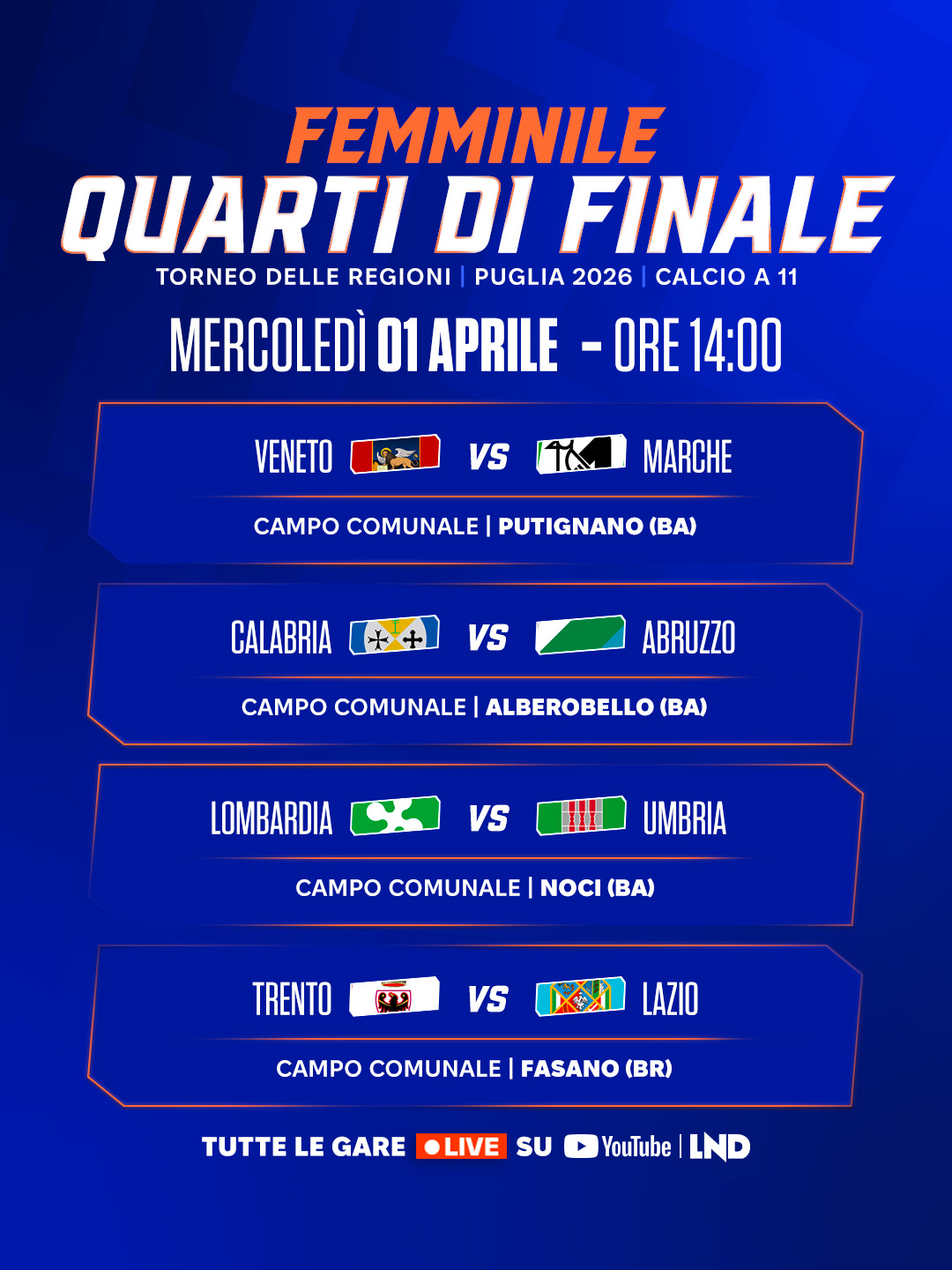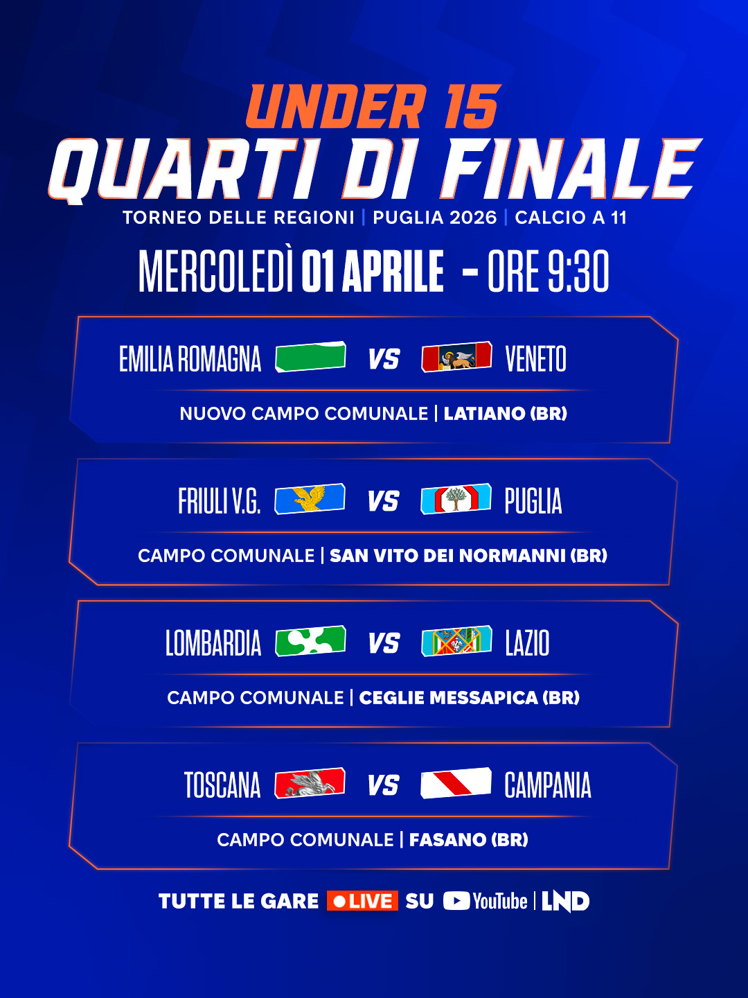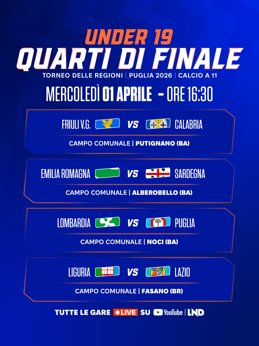 Di seguito il programma dei quarti di finale completi di orario e sede degli incontri. Tutte le gare saranno trasmesse in diretta streaming sul canale YouTube della LND.